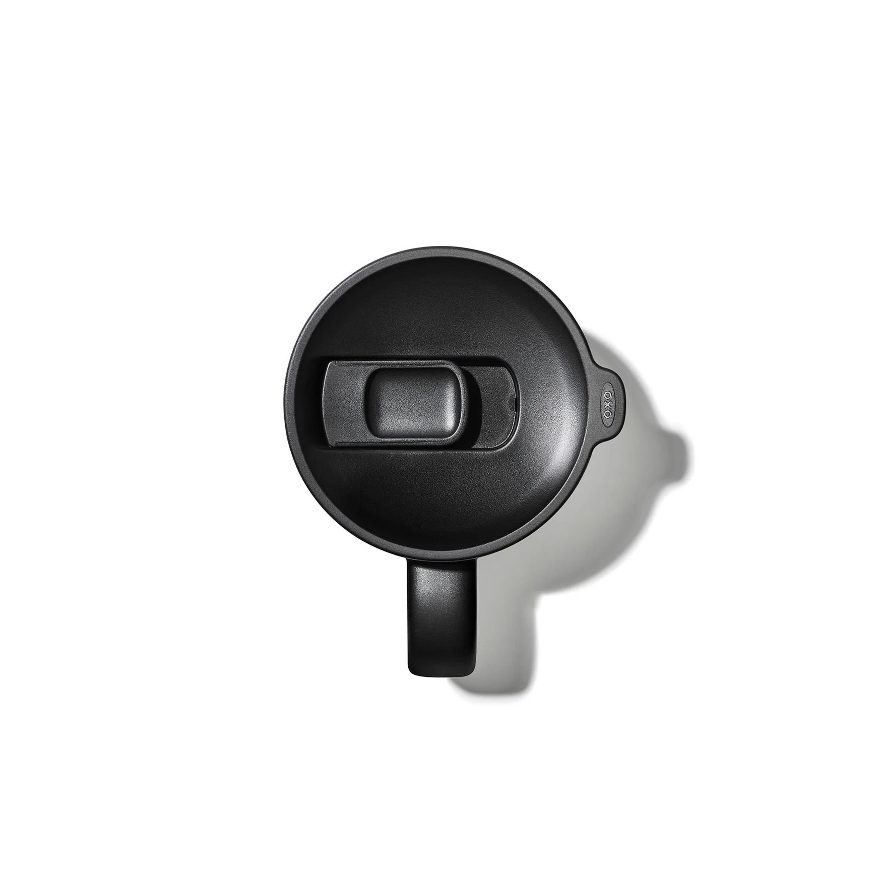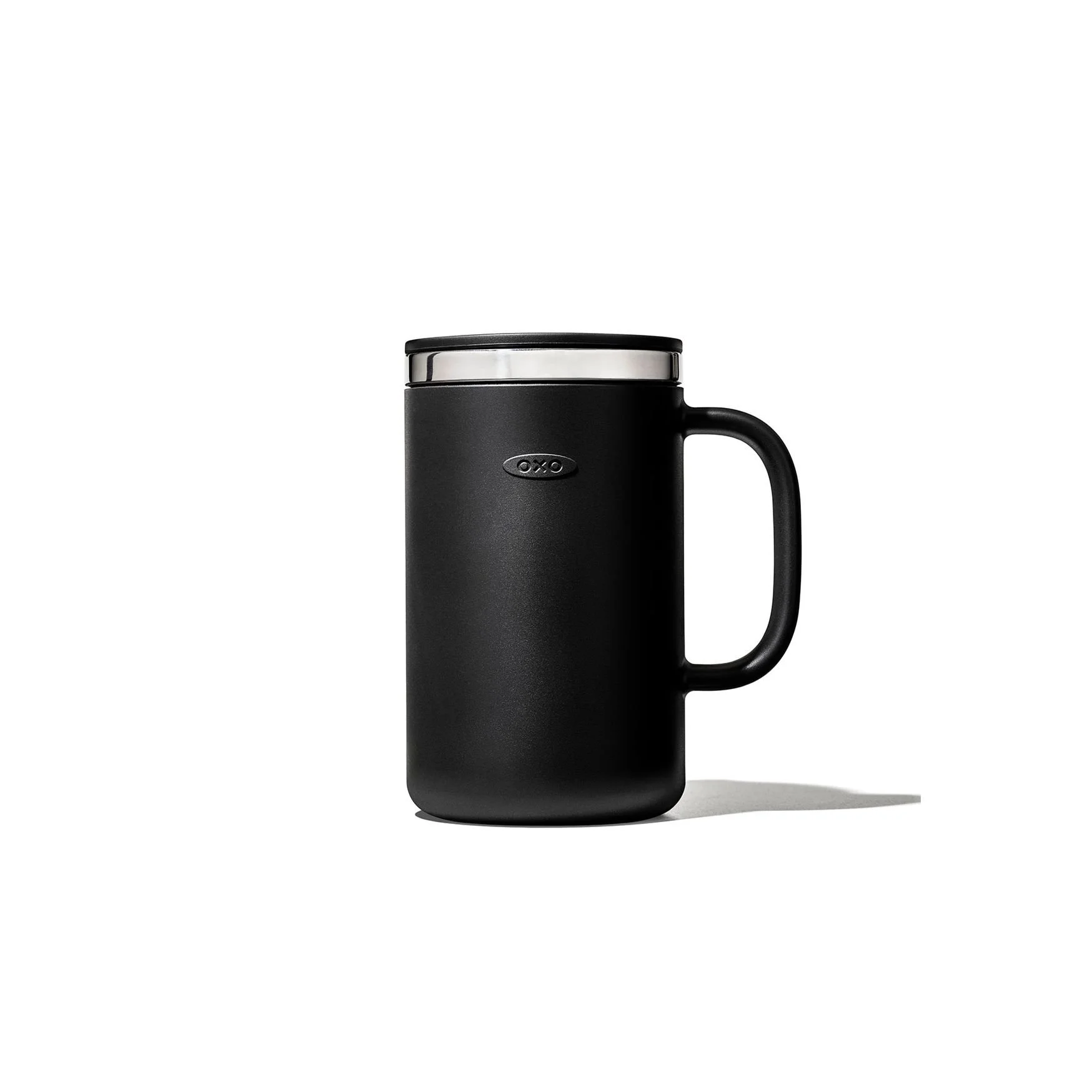 The OXO Strive Coffee Mug. This 16oz insulated mug is taller and slimmer than its competitors. It features a press-fit lid with a sliding closure to prevent spills on the go. The soft-touch handle is wide and textured for a more confident and comfortable grip.